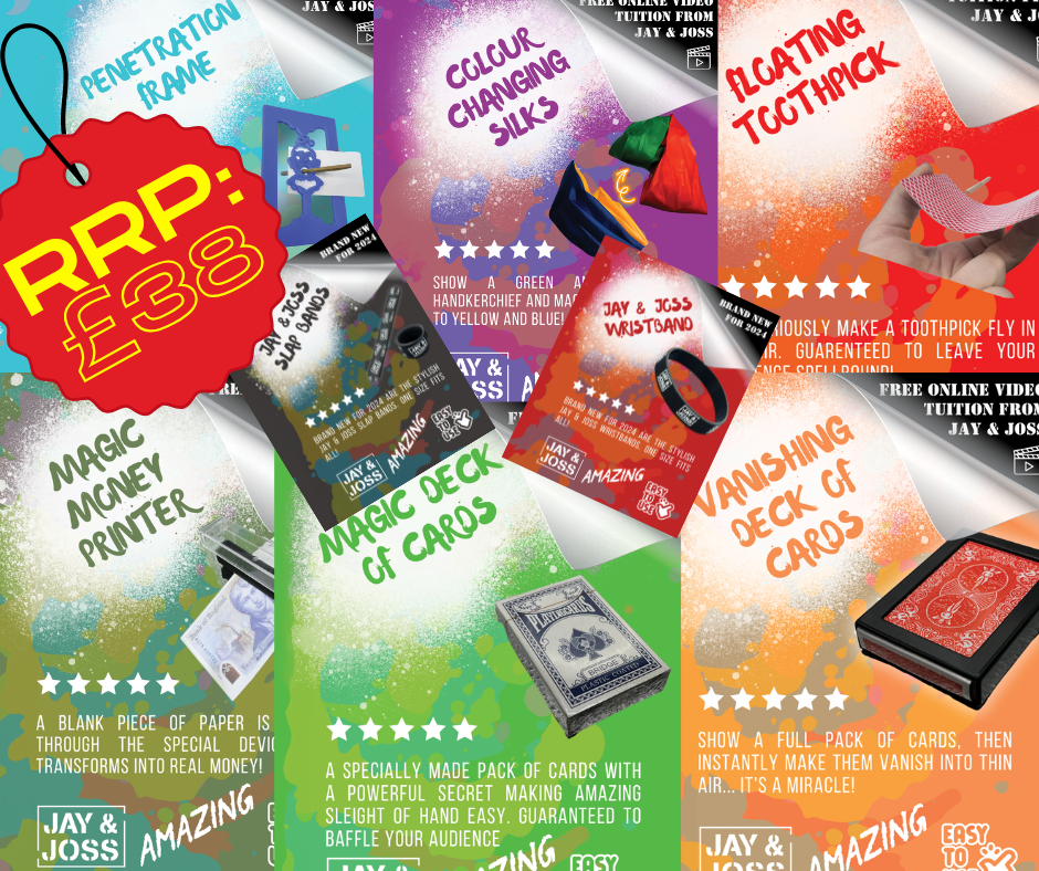 Unlock the ultimate Jay & Joss experience with this limited-edition Black Friday bundle. Perfect for magicians, collectors, and fans, this exclusive set contains 6 signature mind-blowing magic tricks, 1 multi-use magic wand plus 2 premium apparel items, all curated to elevate your performances and your style! Each magic trick comes with free online tuition videos from Jay & Joss themselves!